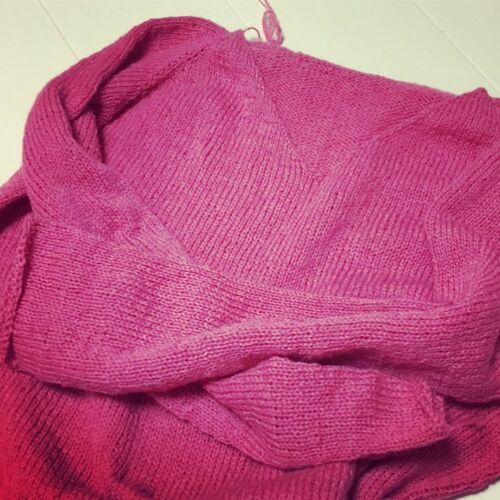 チェリーピンクの Holiday でけたー。糸始末と水通ししなきゃ。暑苦しい毛糸ものですまぬです(*´ω`*)