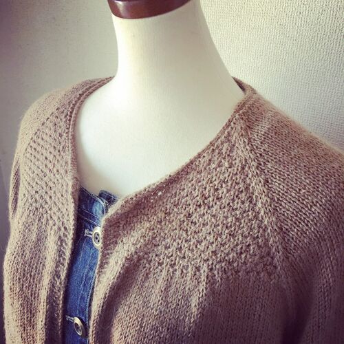 ずいぶん前に完成したつもりだった母のdexter なんですが、羽織ってみたら袖丈が私のジャストサイズ(水通しでタテに伸びたかも…)。 ・ いくらなんでもこれは長いだろうということで編み直し。5センチほど詰めました。悩みだったボタンは母に丸投げすること…